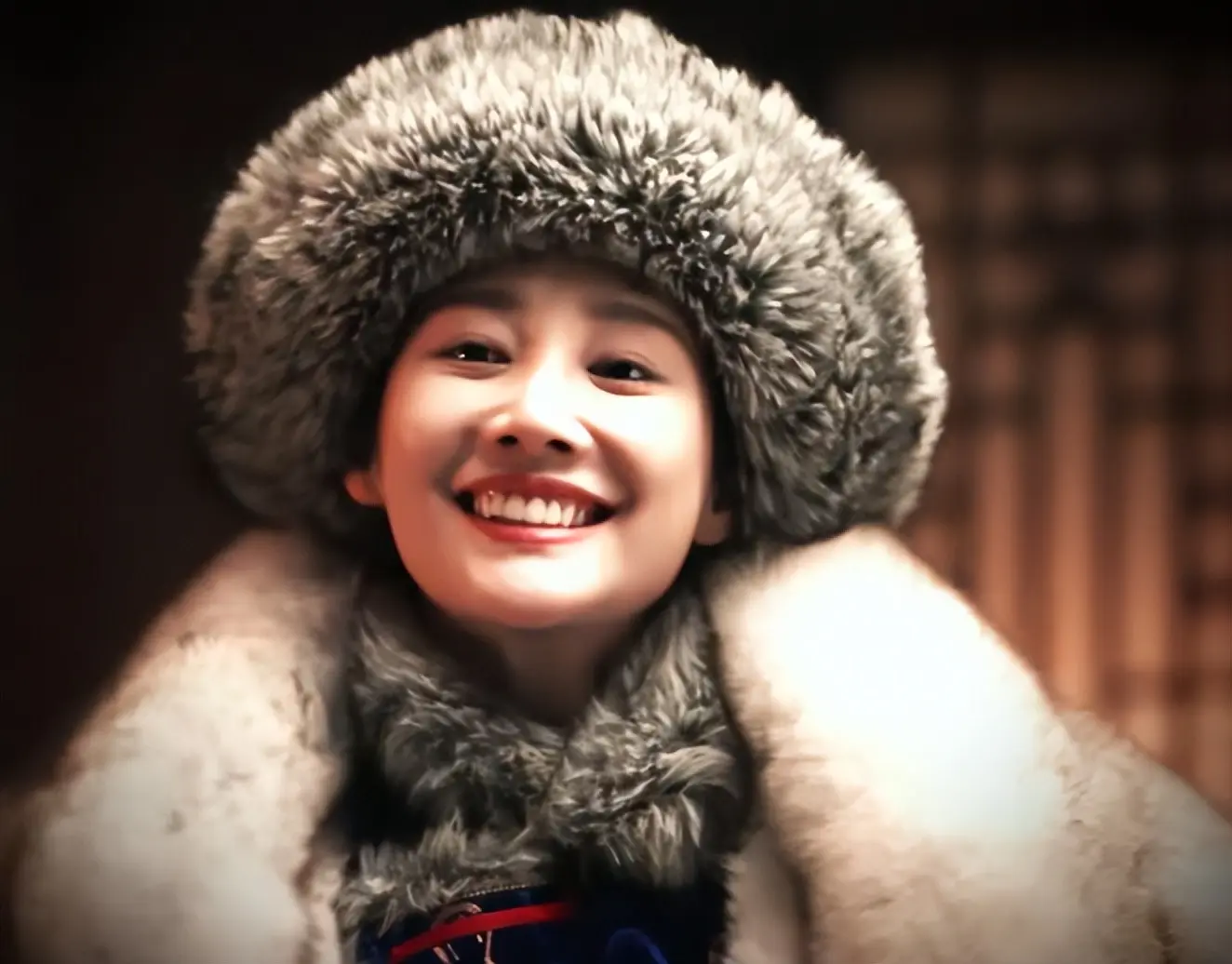 脸型圆润,妆容精致,还有标志性的八字刘海。